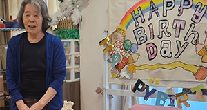 パーンとクラッカーの音でお出迎え、ケーキと職員からの贈り物