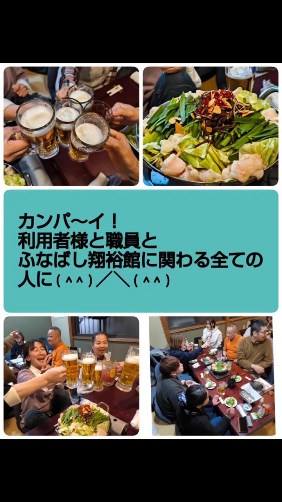 ふなばし翔裕館グループホーム!デイサービスです! 親睦会を行いました!他愛もない話からいつの間にか仕事の改善や心配事の話、意見交換会に。笑笑 明日からの活力に繋がる有意義な場となりました! ふなばし翔裕館に関わる全ての方に カンパーイ