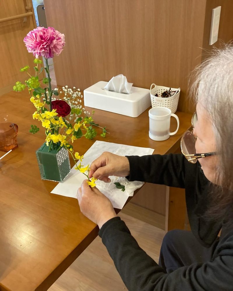 みなさん目の前に花材を置いたら、さくさくとハサミで花器に合わせてカットされ、生けながら「ここに入れる?あ、こっちかな」と集中しながら生けられました。