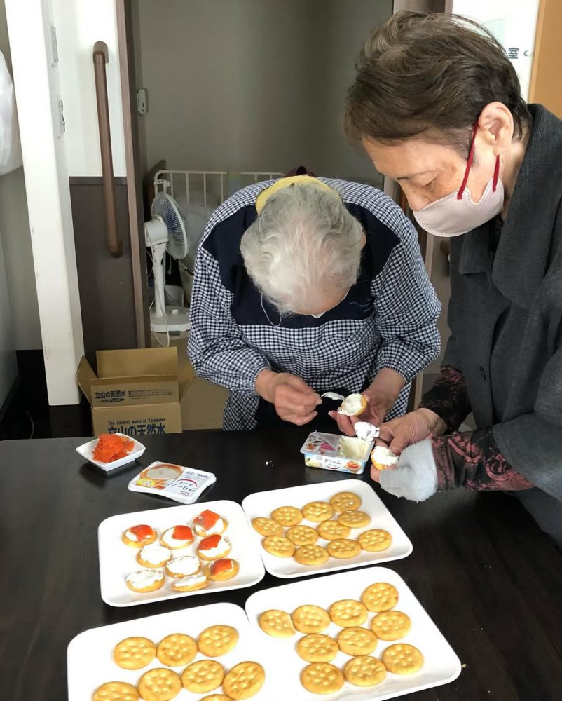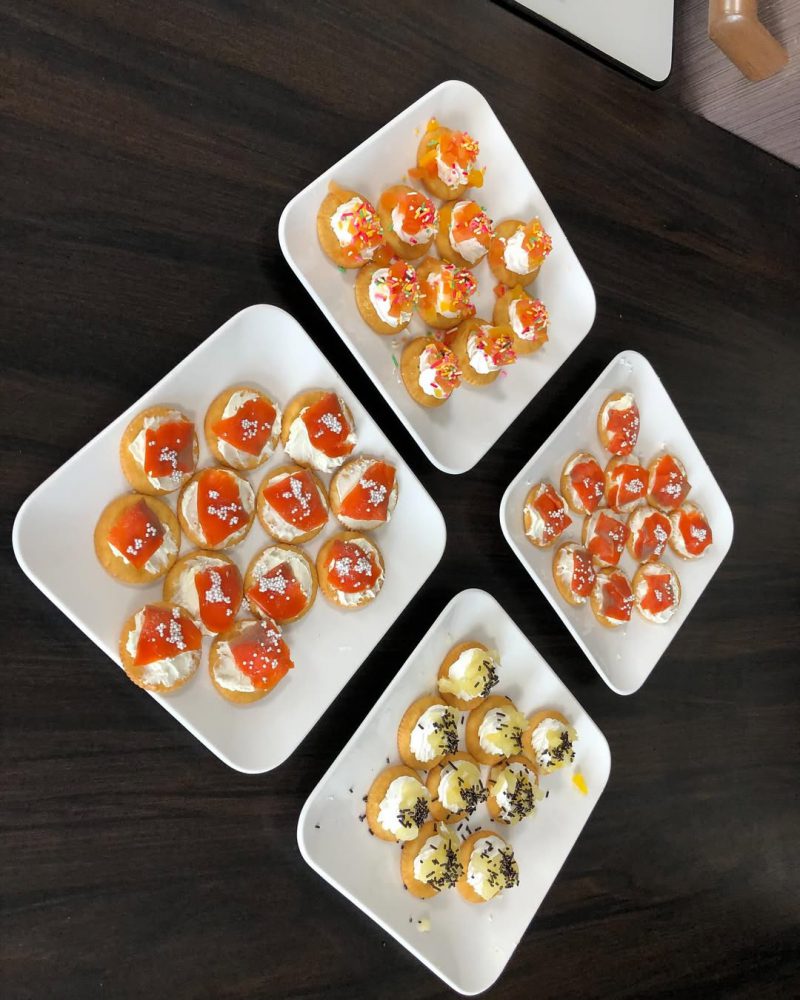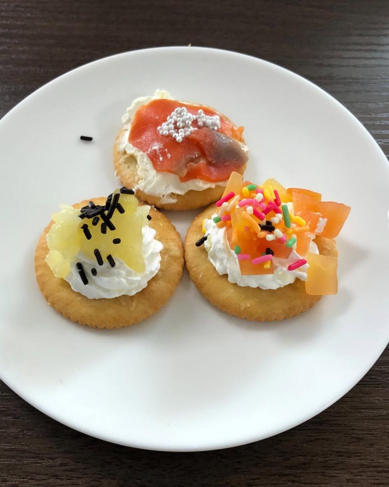 生クリームの甘いものと、クリームチーズを塗ったサーモン乗せた、2種類を作ってオヤツに皆さんで食べました♪