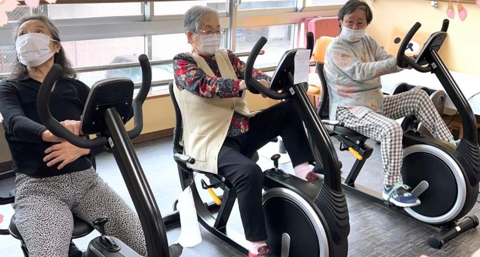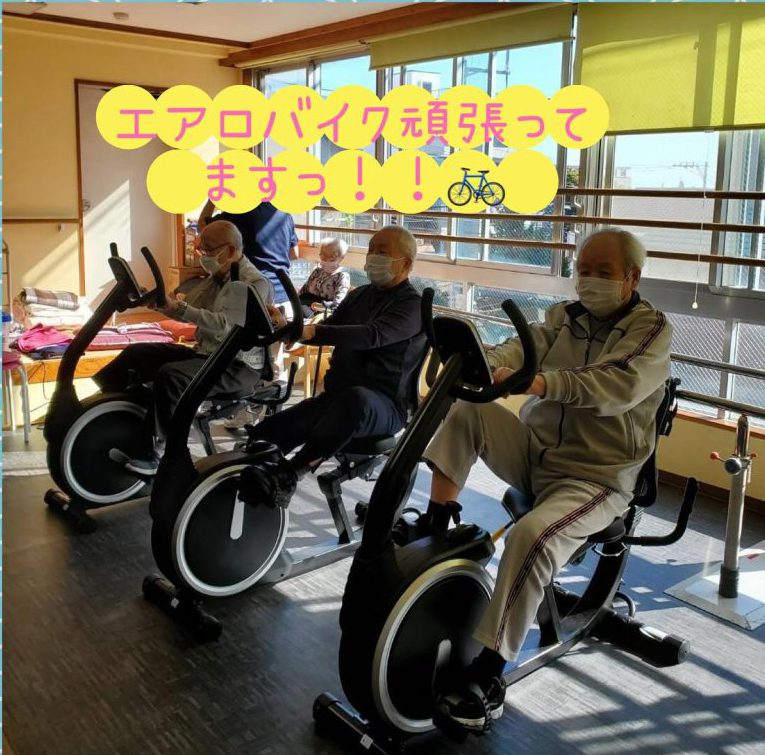 また機械を使った運動の他に職員が号令をかける筋力体操などを行い上下肢をしっかりと動かしています