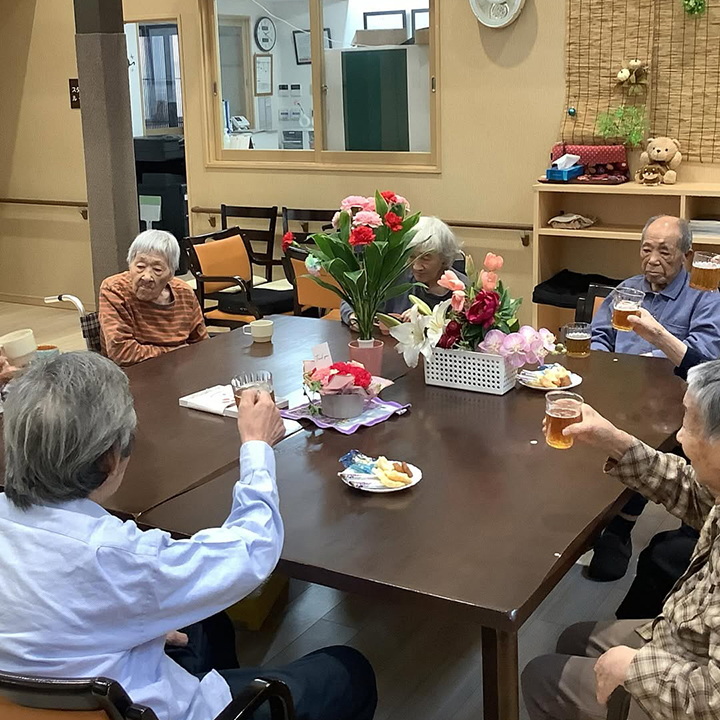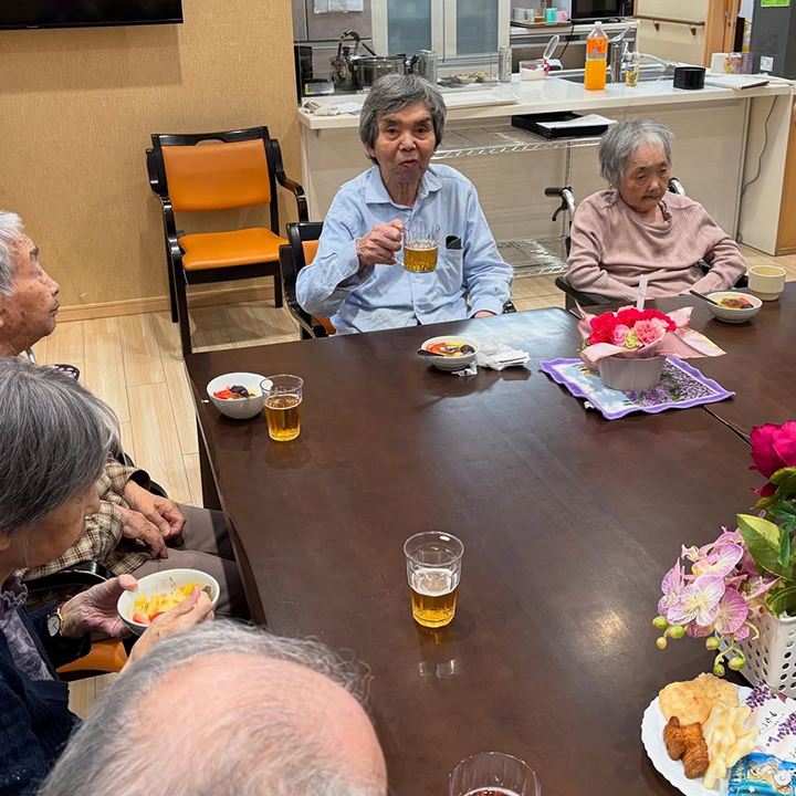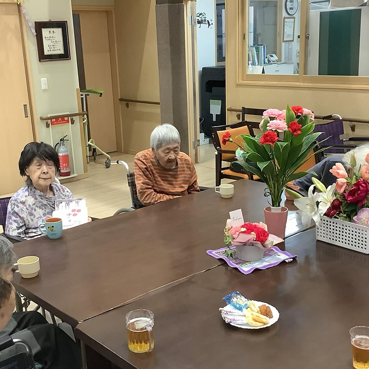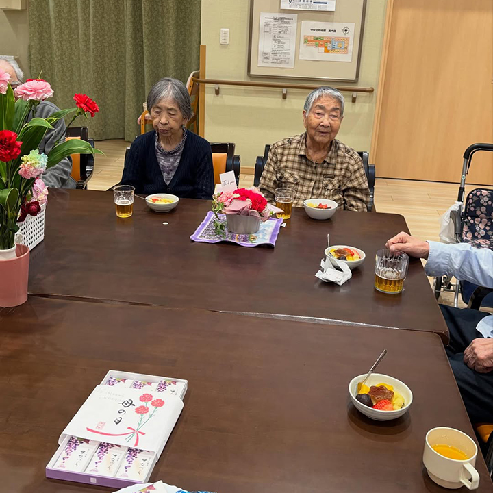 今日は母の日ということで利用者様のご家族様から頂いたお菓子や用意したビールやジュースで乾杯をしました。