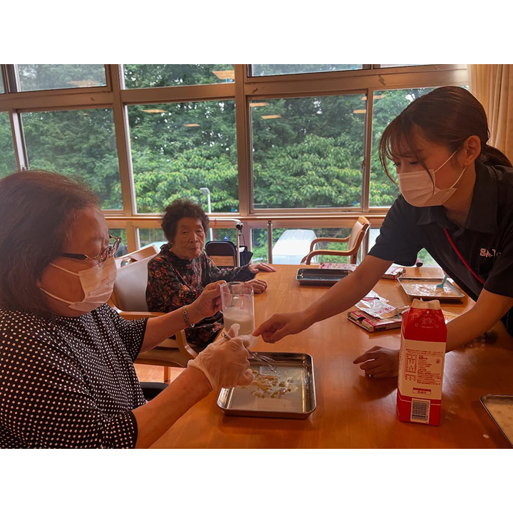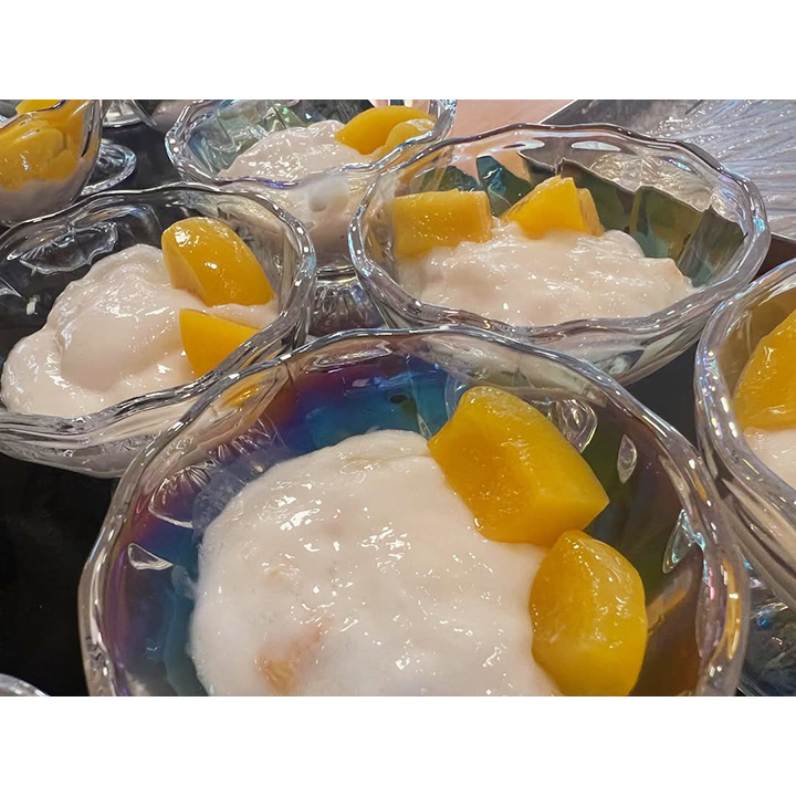 皆様にフルーチェ作りを手伝っていただき、職員でカットした黄桃を添えて出来上がりです