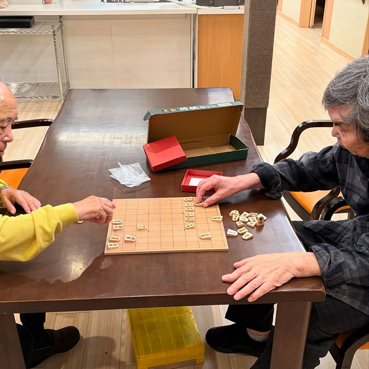 利用者様同士で将棋を楽しまれていました。 お互いに駒の動かし方を確かめながら戦略を練り、楽しく笑顔で話されていました。