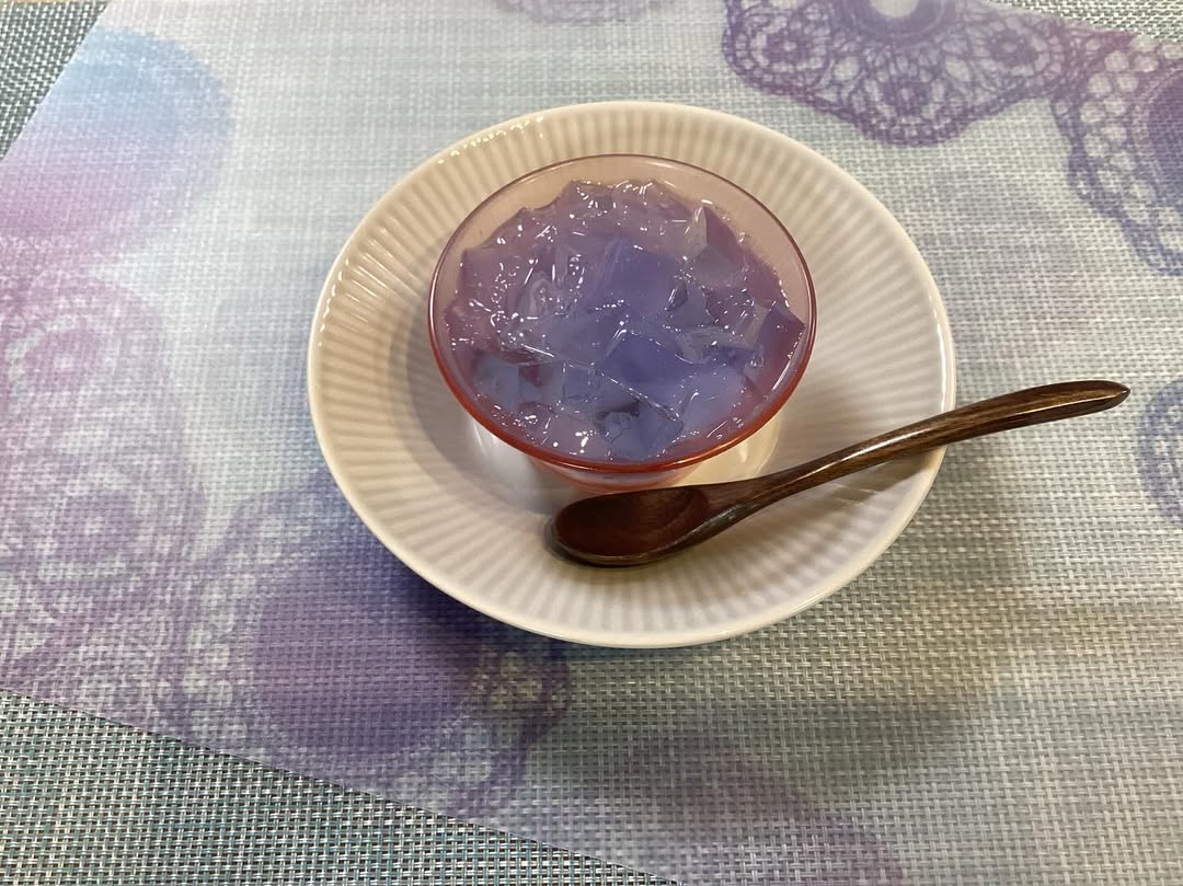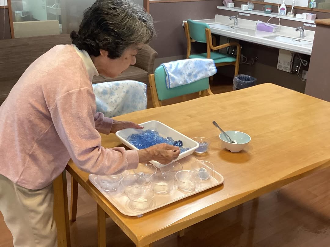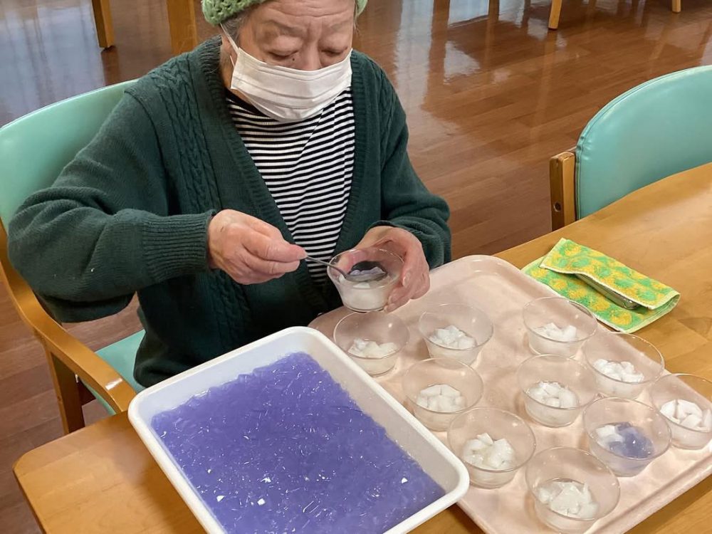 紫陽花も綺麗に咲き始めました。という事で今日のおやつアクティビティは紫陽花ゼリー作りを利用者様にお手伝い頂きました