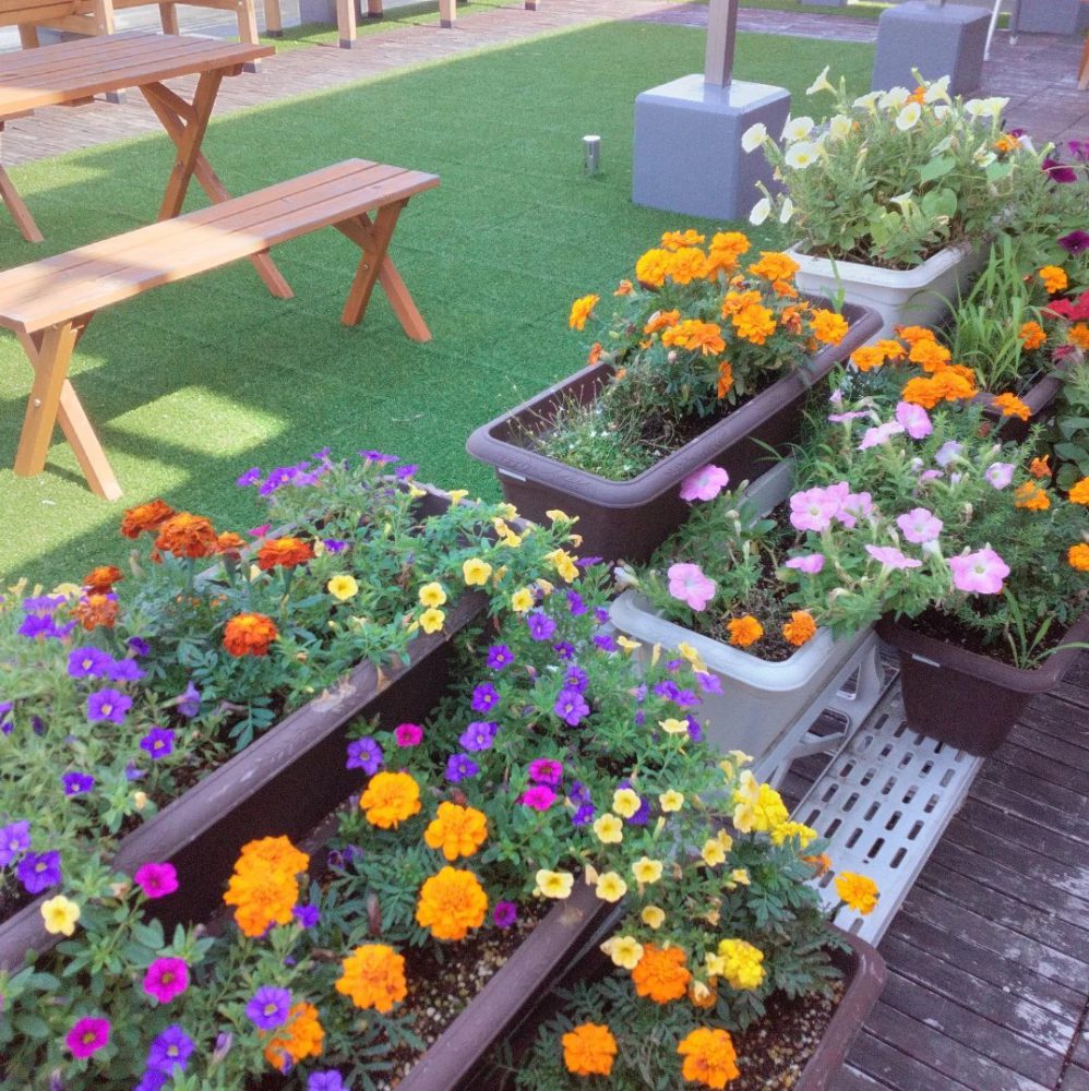 二階のバルコニーです。お花が満開になっています。ご利用者様からも眩しいくらいねと好評です。