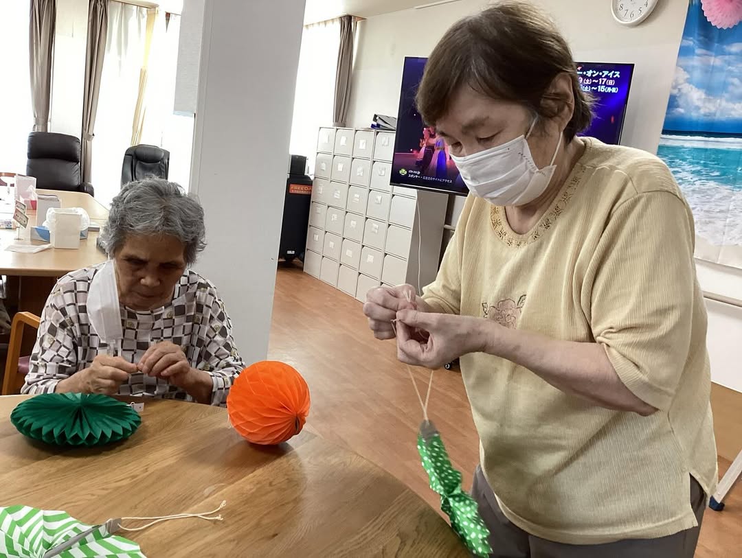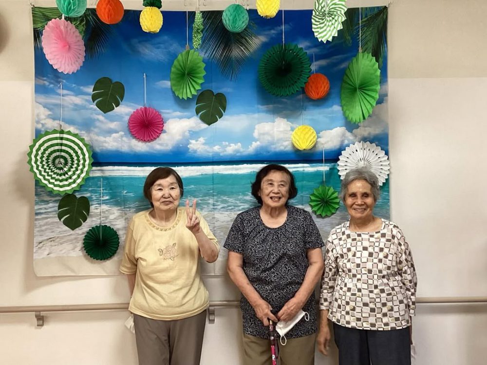 梅雨が明け、アジサイから夏バージョンに模様替えしました。 利用者の方にも手伝って頂きました。 「あそこにつけたほうがいいんじゃない?」「こっちがいいと思う。」と教えていただきました