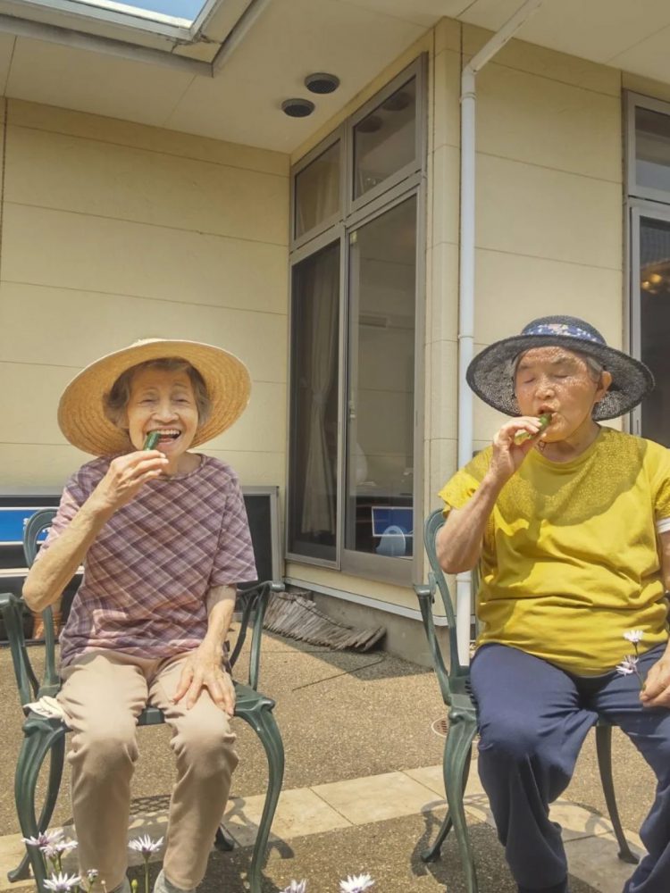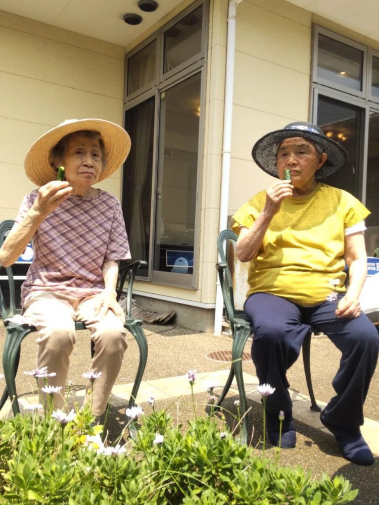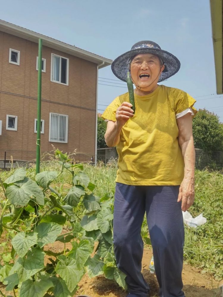 ふなばし翔裕館グループホームです! 家庭菜園を始めました! 早速キュウリの収穫!! 採りたてを「パリ」 いい〜!お顔です。