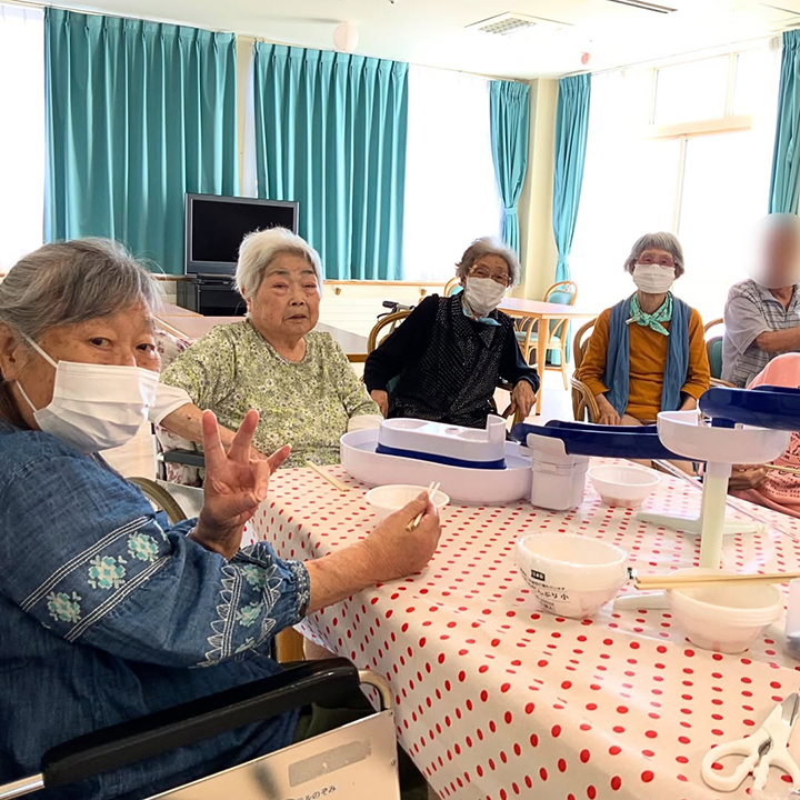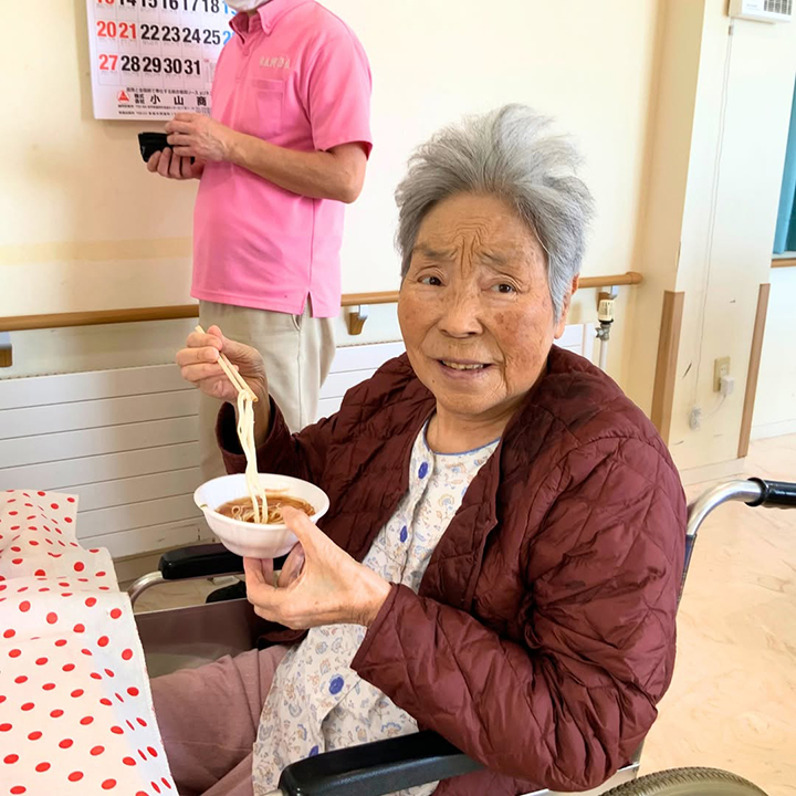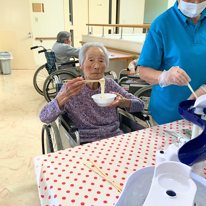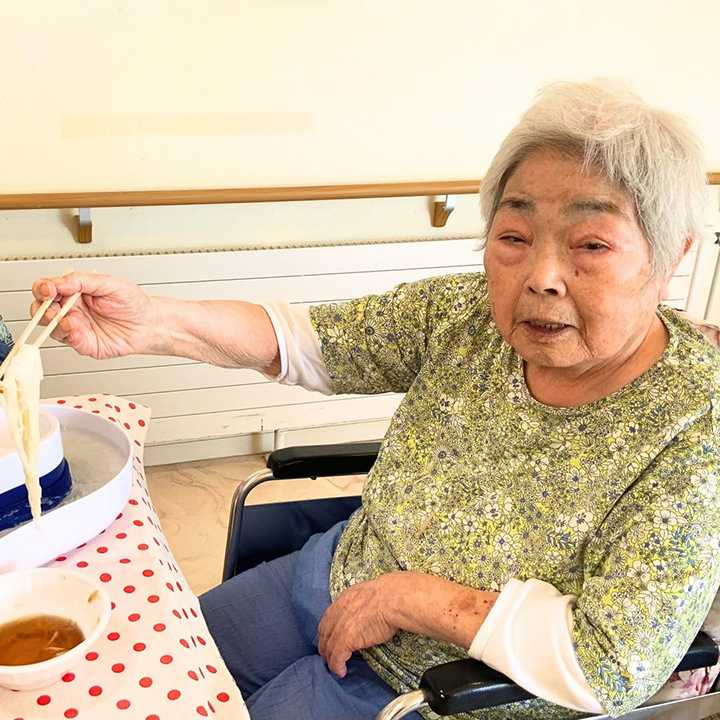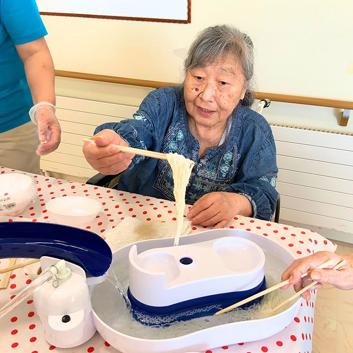 稲庭素麺と揖保乃糸を流して、ご利用者様に食べ比べて頂きました。