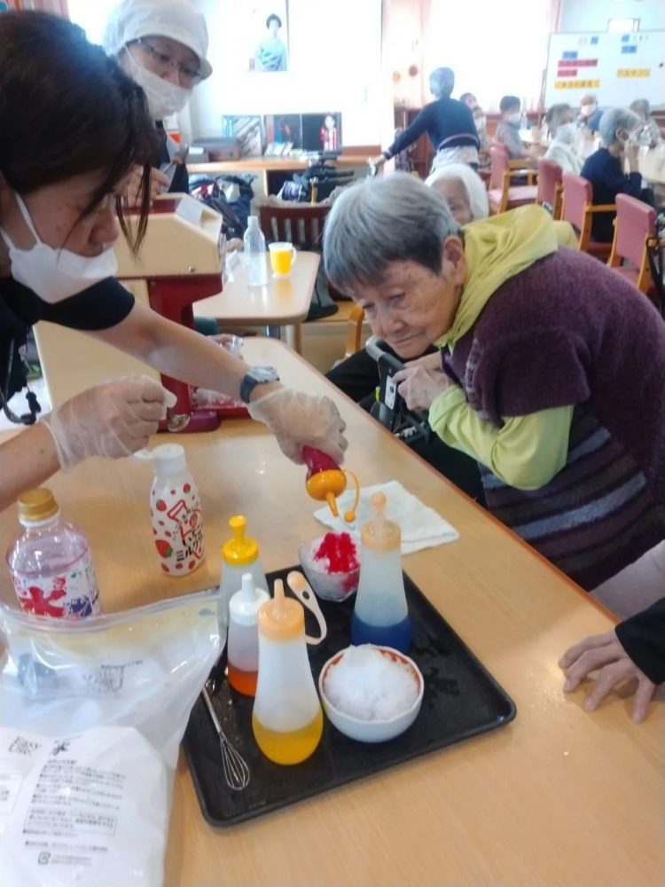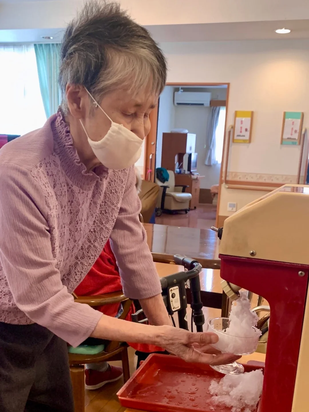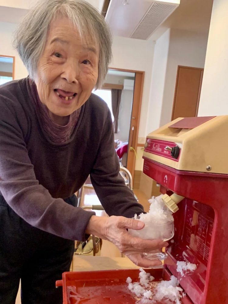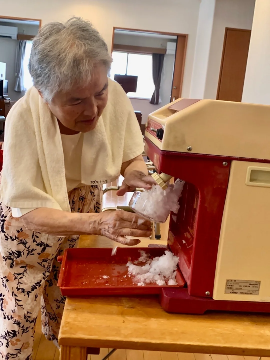 ふなばし翔裕館グループホームです! かき氷 いちご、めろん、レモンにブルーハワイ!甘いシロップどれにしよ〜?? ギャージャーと、自分で削った氷は 格別!!