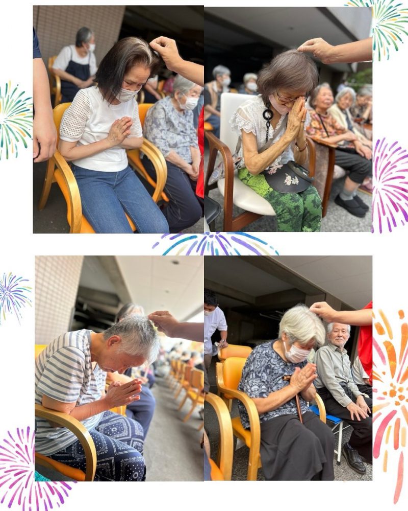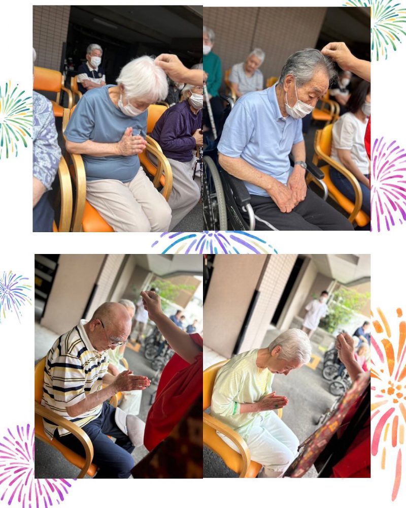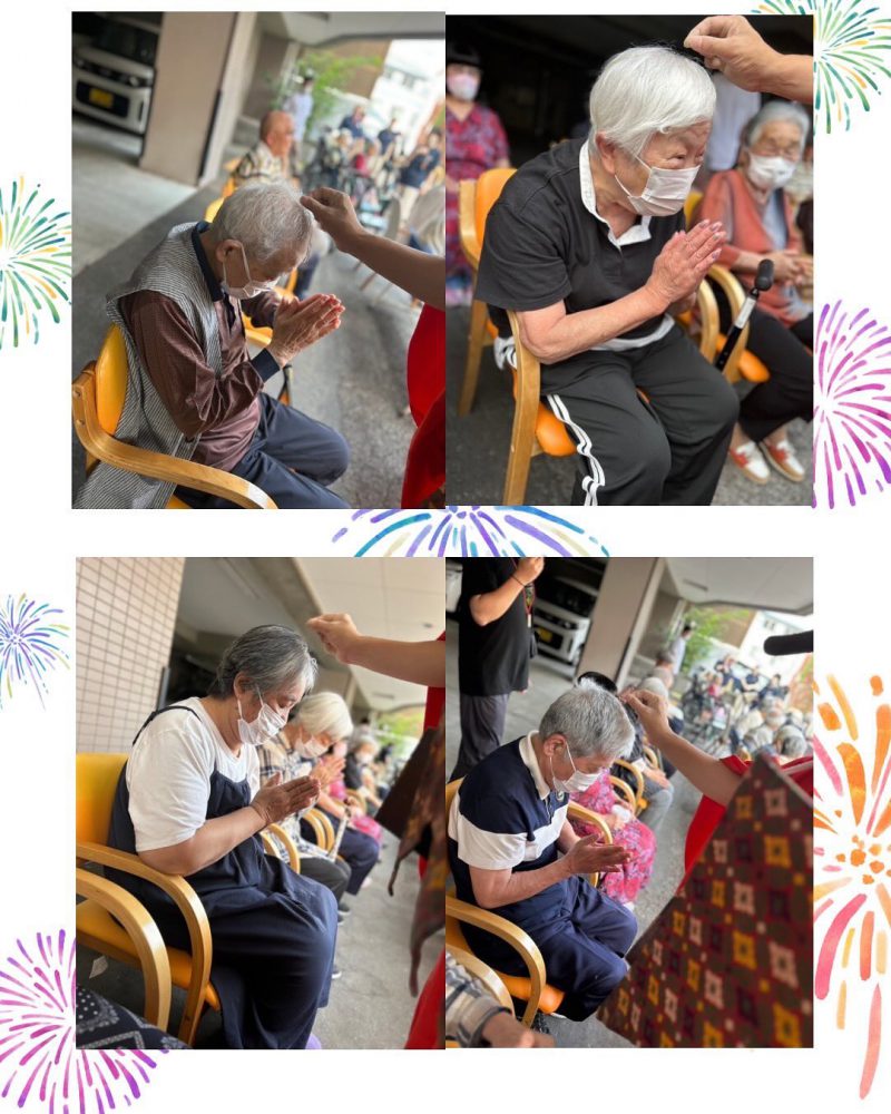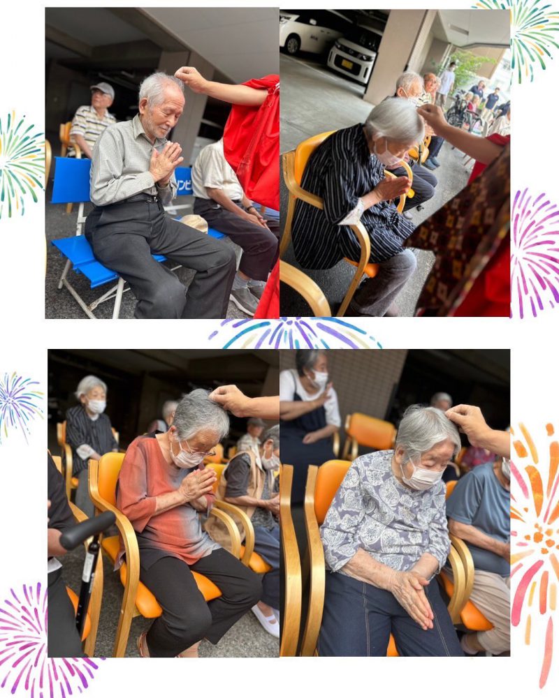 そして「こがし祭り」開催に伴い天狗さんが、あたみ翔裕館に来訪され来宮神社の縁起物とされる「麦こがし」を頭に振りかけてくださり、厄災を祓い、健康長寿のご利益をいただきました