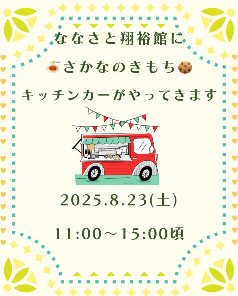8/23(土)11:00〜15:00頃 ななさと翔裕館に七里のさかなのきもちさんのキッチンカーが来てくれます ナポリタンやクッキーが並ぶ予定です 当日は昭和レトロ喫茶を開催しますので皆様お誘い合わせの上お越しください お待ちしております