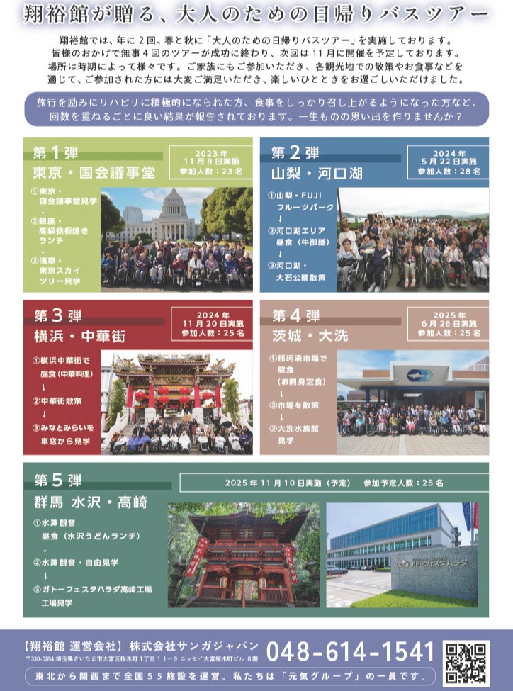 弊社では「大人の旅行倶楽部」と題しまして、介護スタッフがお付き添いしましてのバスツアーをご用意しております。