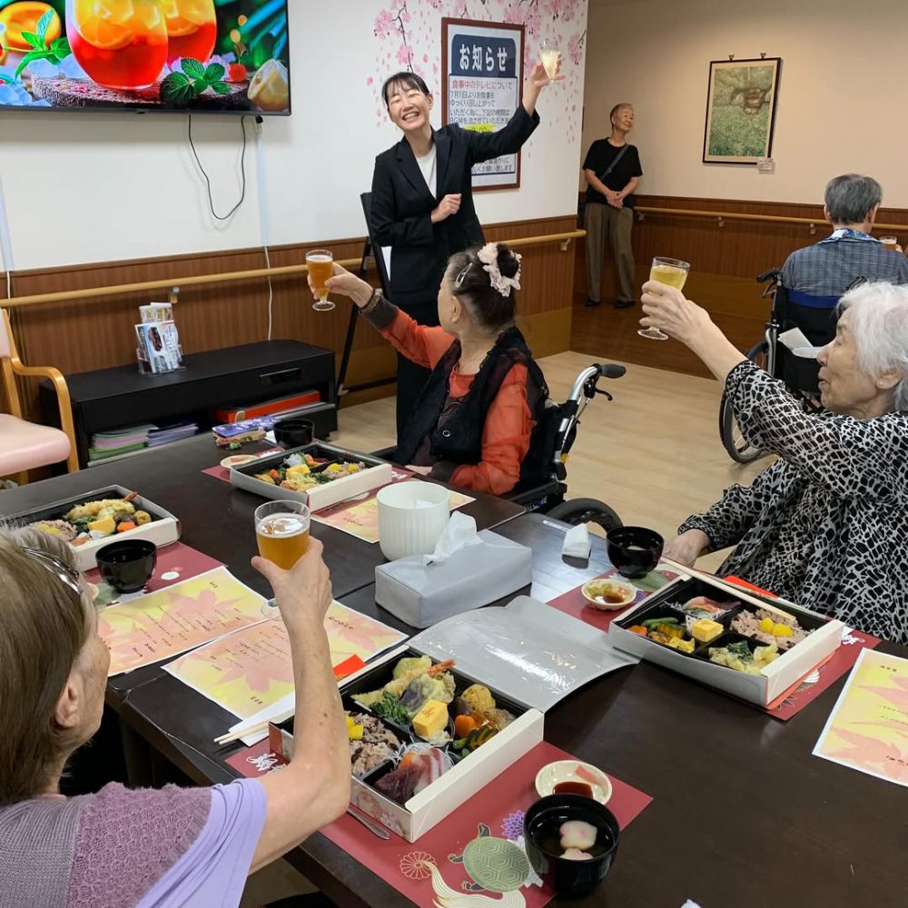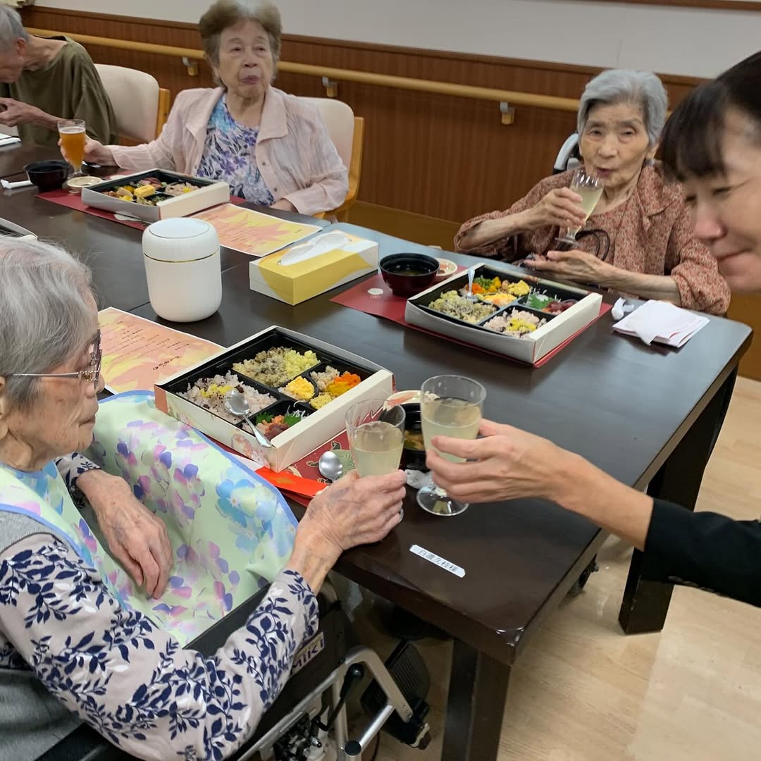 浦和さくら翔裕館 9月半ば過ぎましたが 暑い日が続きますね〜 いかがお過ごしですか? さてさて‥‥ 先日の敬老会で お昼は、敬老御膳でした♪ 食事の前に乾杯しました いつまでも元気にお過ごしくださいね☆
