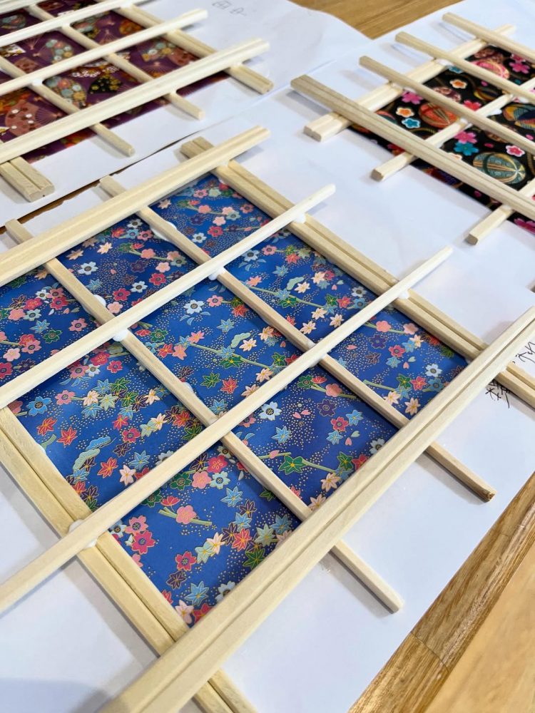 完成したタペストリーを眺めて嬉しそうな笑顔も