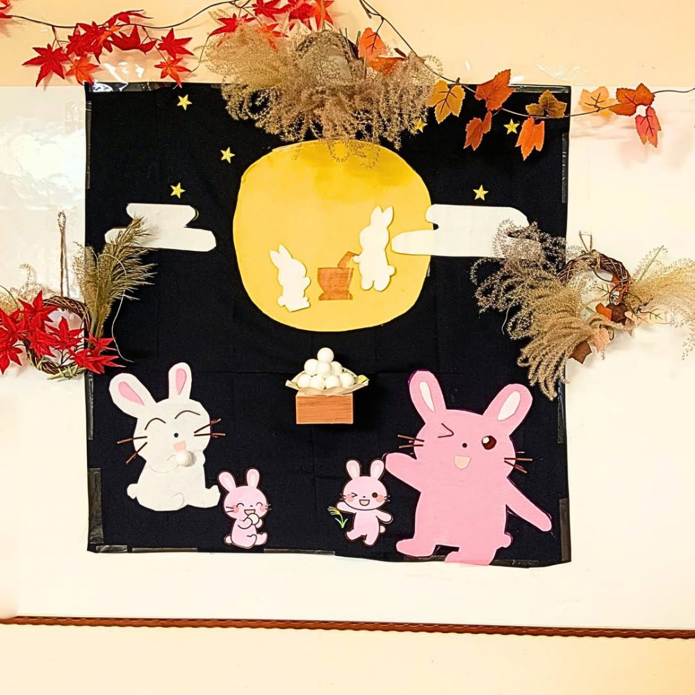 もうすぐ十五夜という事で、ウサギとお月見の飾り付けを行いました
