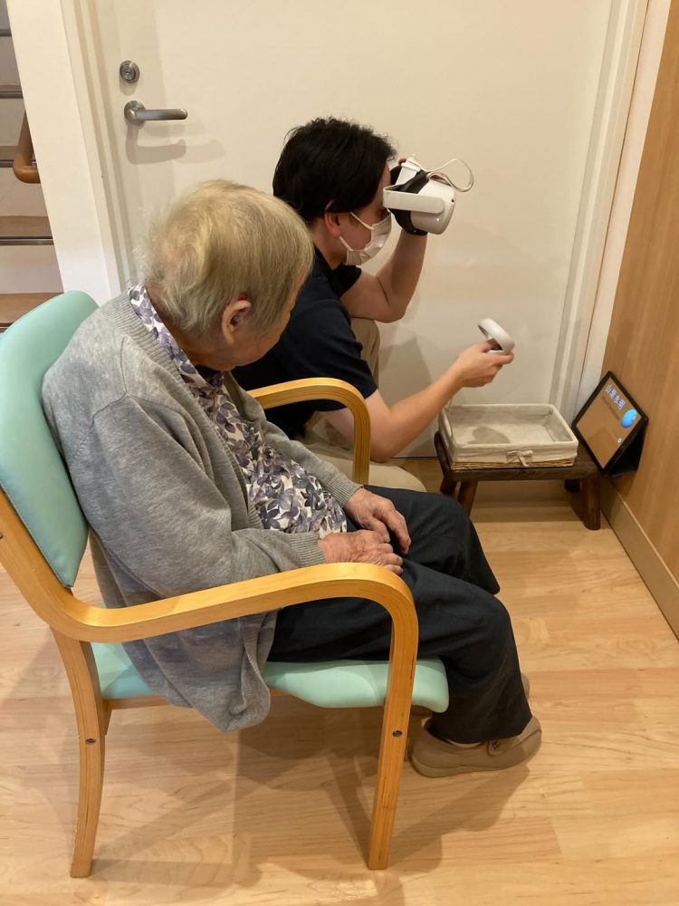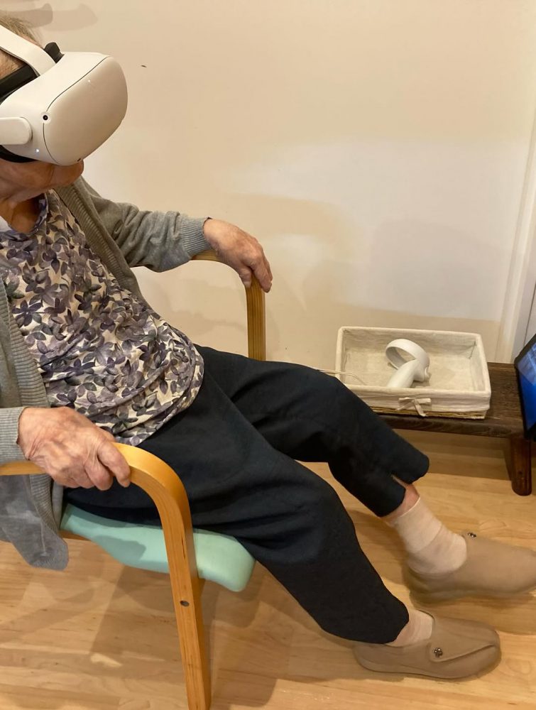今,リハビリの現場で行われているVRカメラを利用した筋力トレーニングを,西おおいずみでも取り入れております。