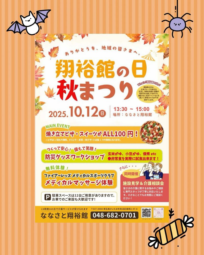 10月12日(日)は翔裕館の日秋まつりを開催します 焼き立てピザやスイーツが100円 防災グッズワークショップやメディカルマッサージ体験が無料です 施設見学や介護相談会も開催しますので、ぜひ皆様遊びに来てください