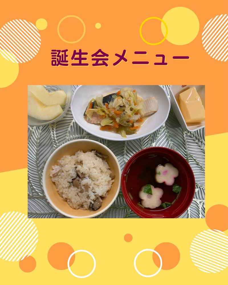 本日は毎月恒例の誕生会でした 誕生会メニューの昼食でお祝いしました