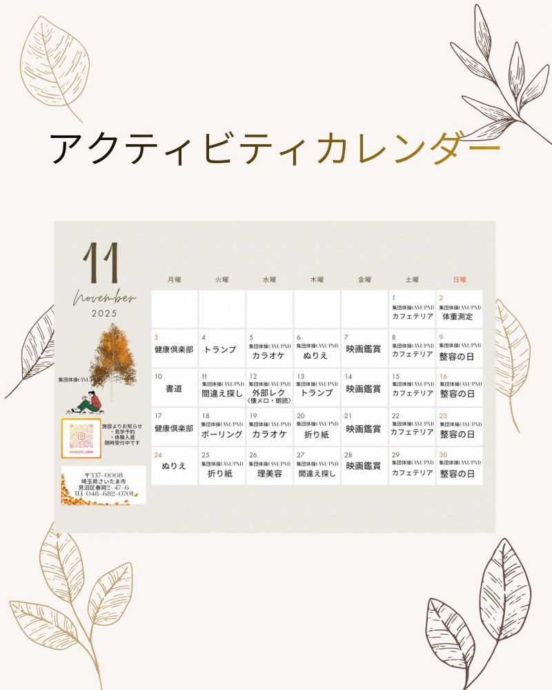 11月のアクティビティカレンダー 今月もたくさん予定しております♪ お楽しみに・・・