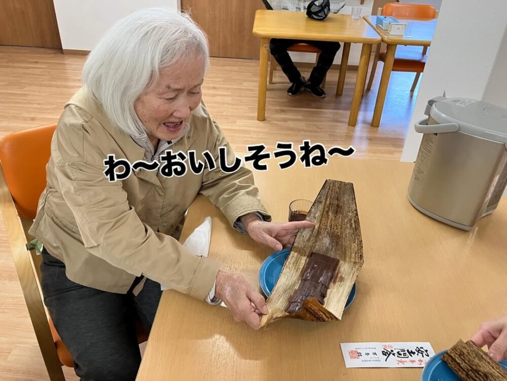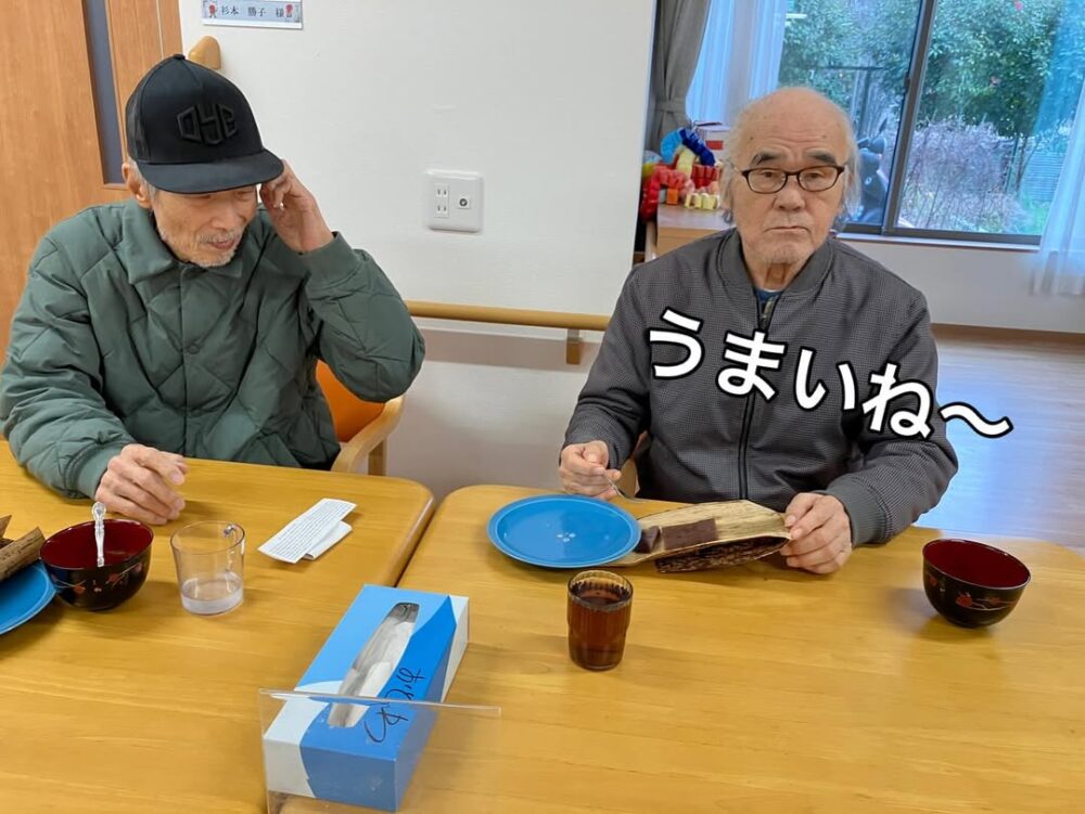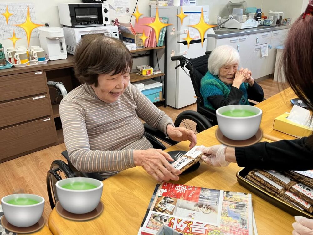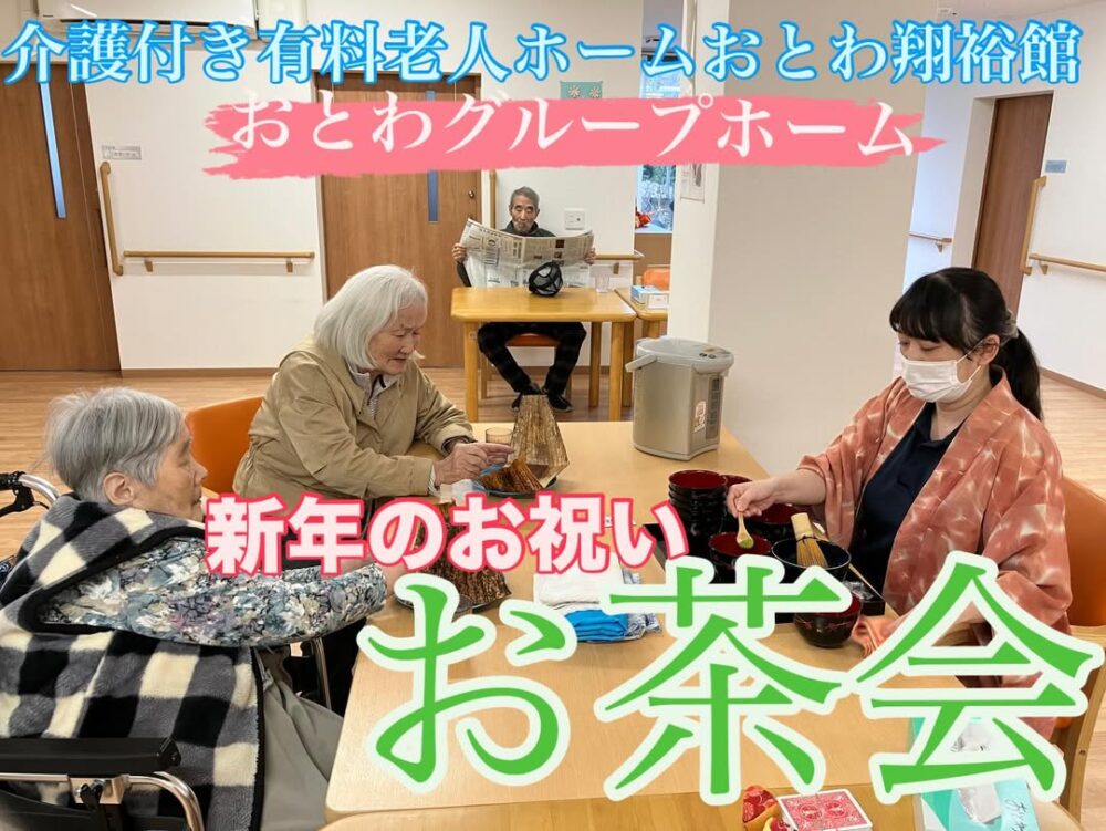 新年を祝うお茶会を開催しました。 羊羹はサンガジャパン西日本支社長からのプレゼントです。ありがとうございます 羊羹のお供は職員が心を込めて点てたお抹茶です おとわ自慢の手作りの栗きんとんもあり、皆さまに大変喜んでいただけました