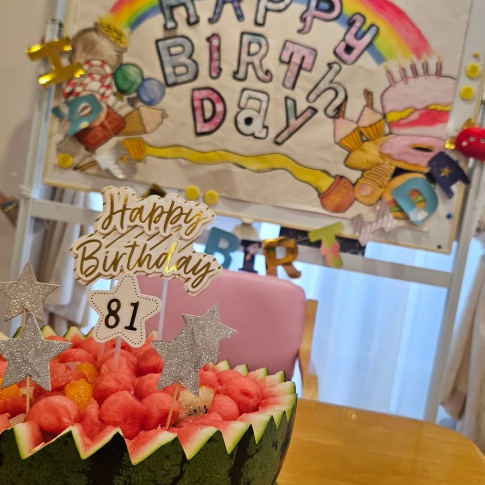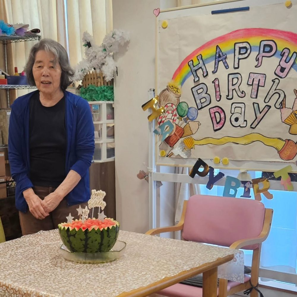 今回バースデーの方は、クリームが苦手とのことで大好きなスイカを丸ごと使用したフルーツポンチでお祝いしました