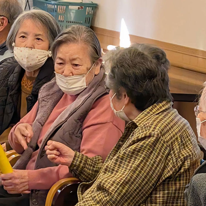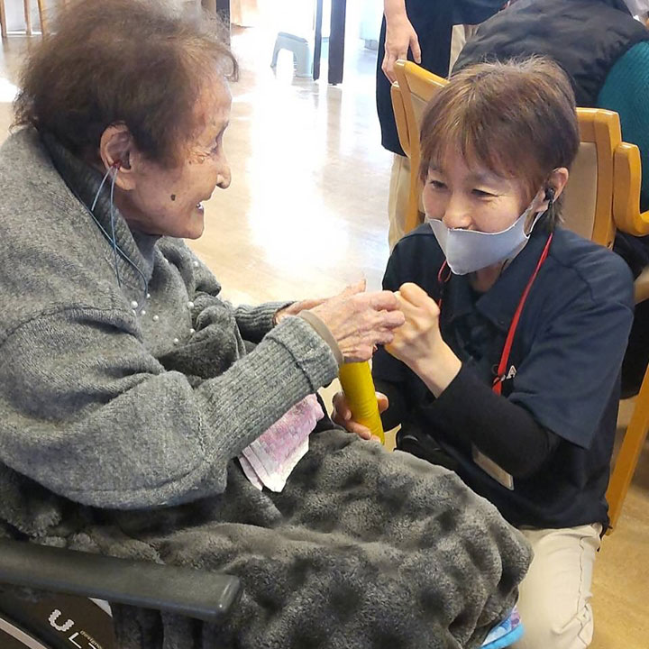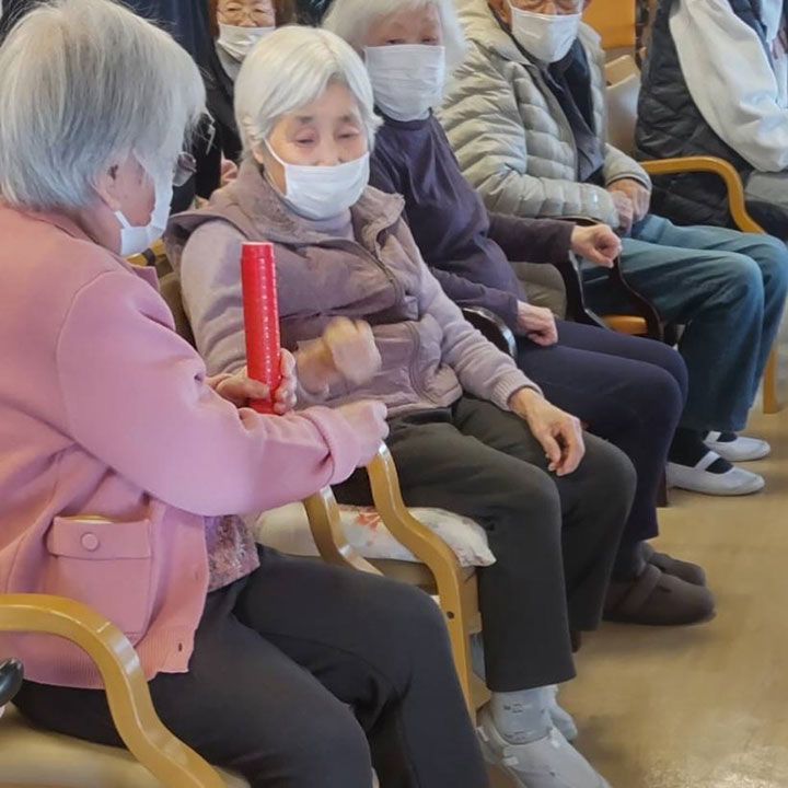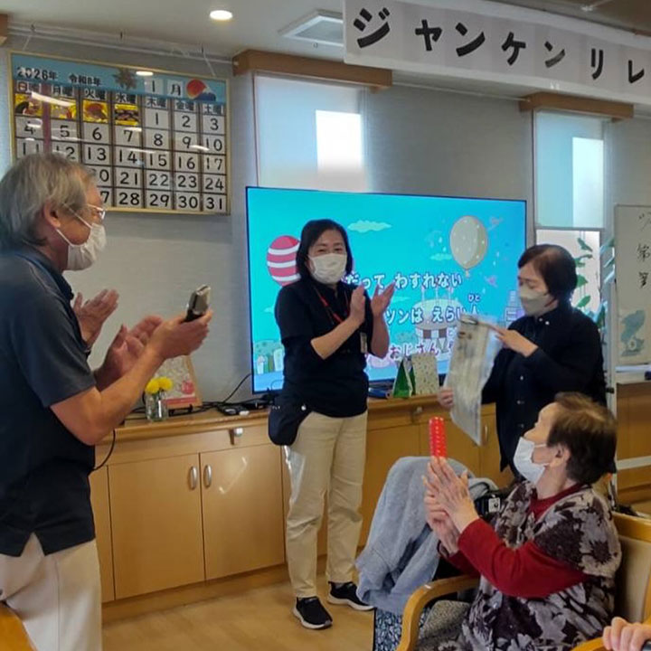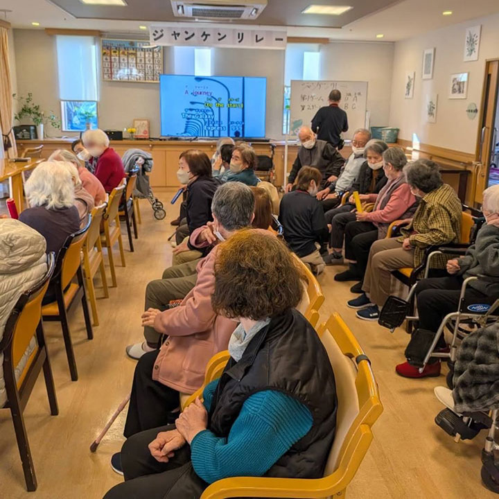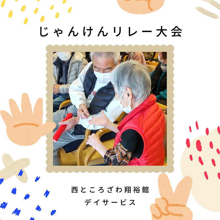 1列に並んでバトンを持ち、隣の方とじゃんけんをして勝った場合のみバトンを渡せるルールです