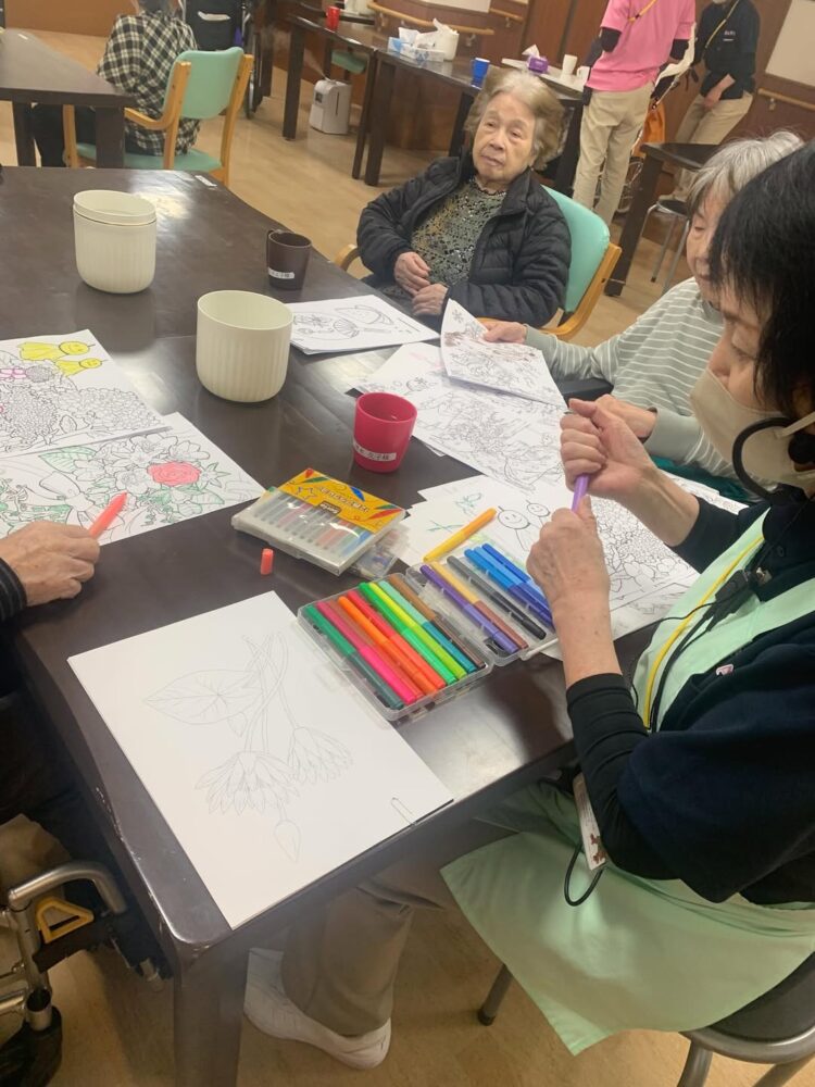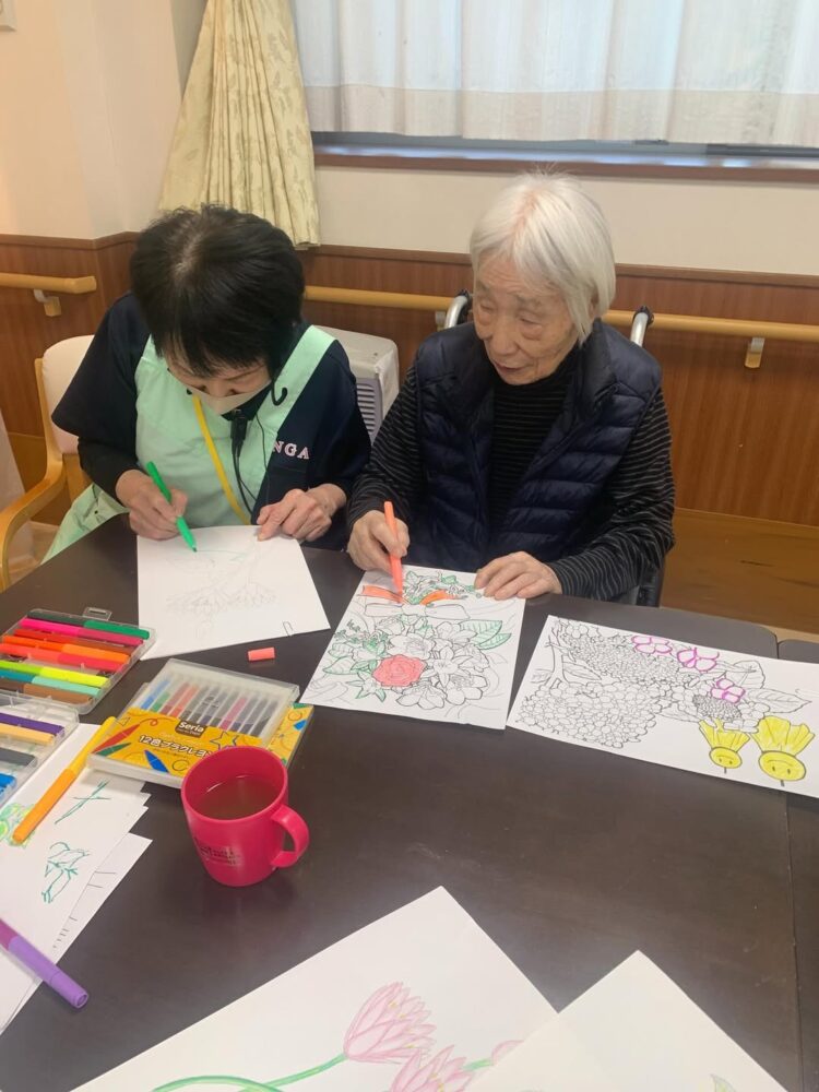 浦和さくら翔裕館 午後ののんびりまったりタイムに潜入〜 3階の入居者様が2階に来られましたよ〜 看護師と一緒にぬりえ たまにはこういうのんびりタイムもいいですよね〜