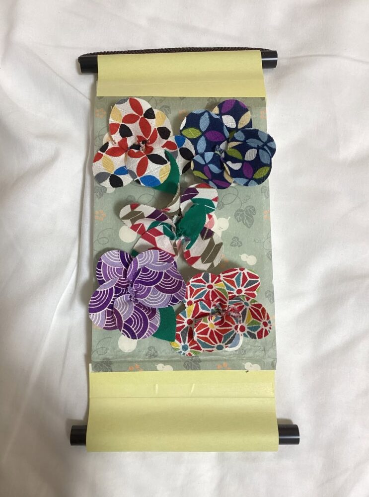 発泡スチロールにピックで布を挿し込んでお花を作る作品。