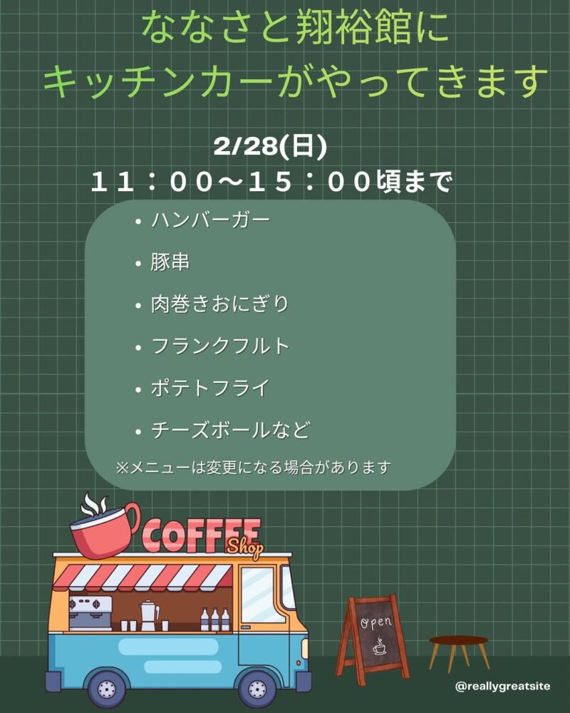 ななさと翔裕館にキッチンカーがやってきます 2/28(日)11:00〜15:00頃まで ハンバーガー肉巻きおにぎりフランクフルト、ポテトフライ、チーズボールなど 是非!皆さまいらしてください ※メニューは変更になる場合があります