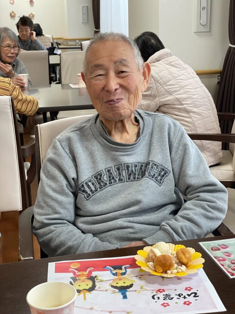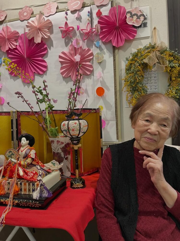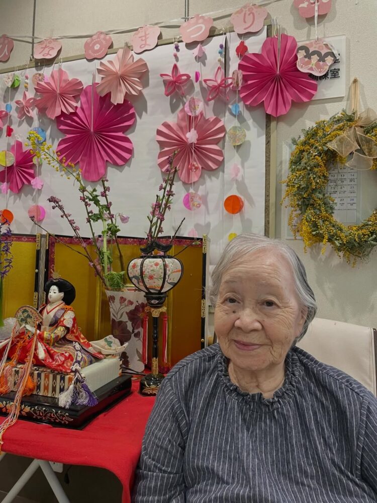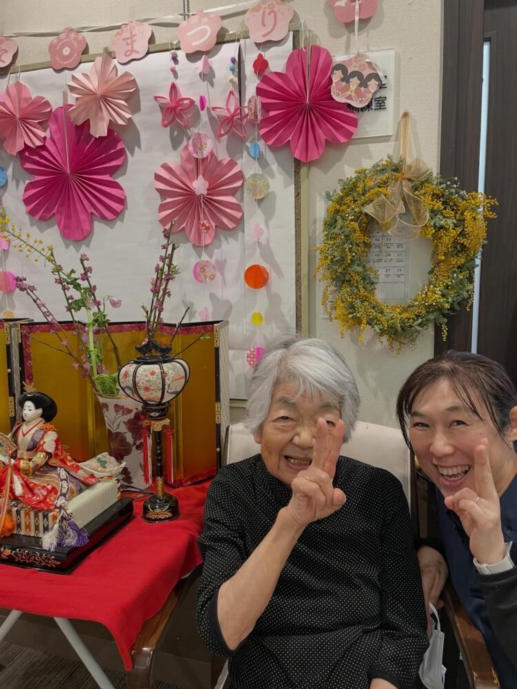 今日はひな祭り お雛様の前で記念撮影。 皆様、お雛様に負けないくらい素敵な笑顔をされていました。