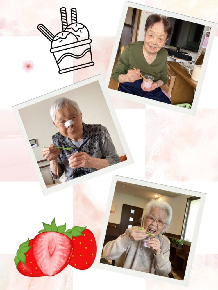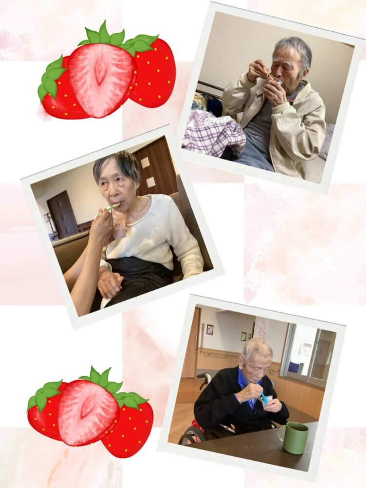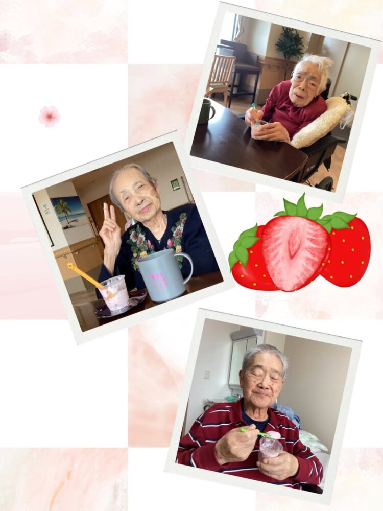どうしてもいけない利用者様達のために、イベント担当の職員がいちごを味わって欲しい。とフルーチェのおやつレクを企画してくれました♪