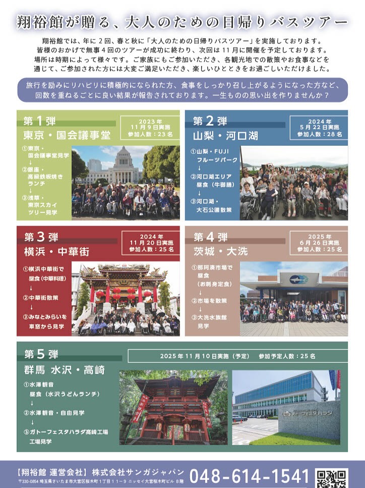 まだ夏を思わせる暑い毎日ですが、皆様いかがお過ごしでしょうか。9月の昼食メニューも変わり秋のメニューになりました!翔裕館では年に2回の日帰りバスツアーを11月に予定してます。ぜひ入居者様にも参加していただき、楽しいひとときをお過ごしいただけたらと思います。