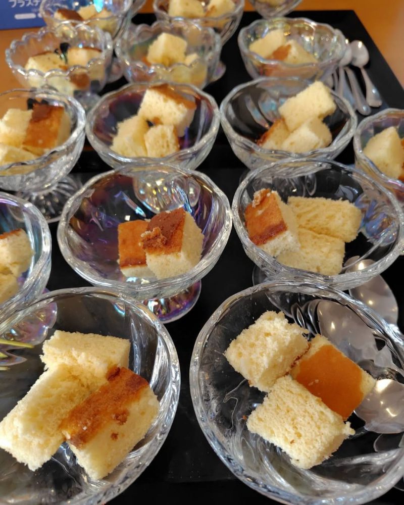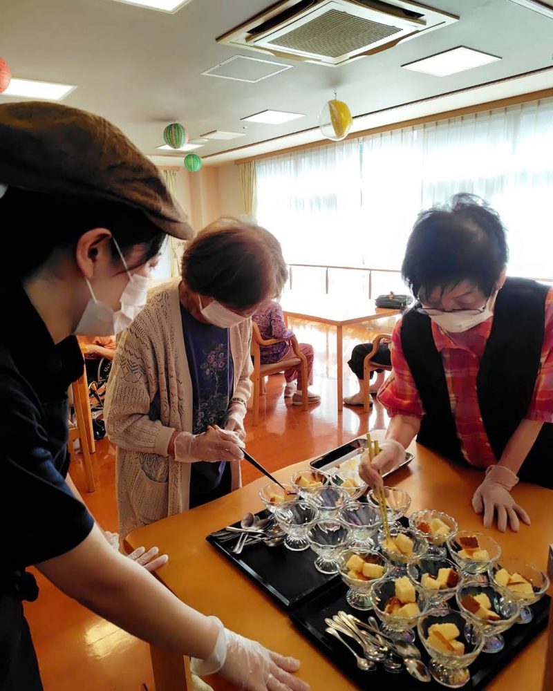 ご利用者様には、カステラの盛り付けとチョコレートソースのトッピングを手伝っていただきました