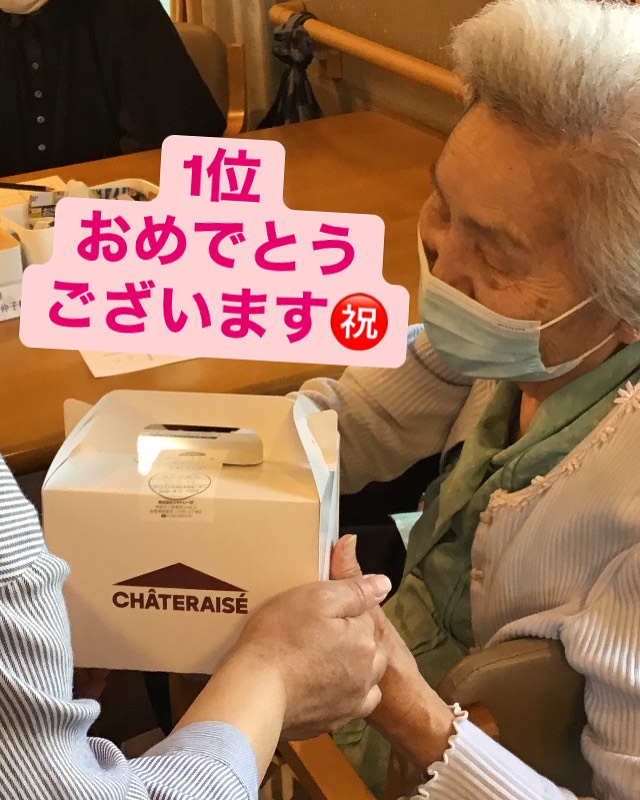 一位の方に景品を渡すと、まさかのケーキにびっくりされてました
