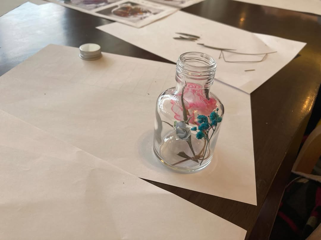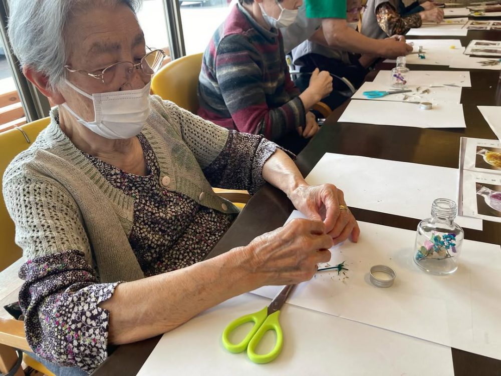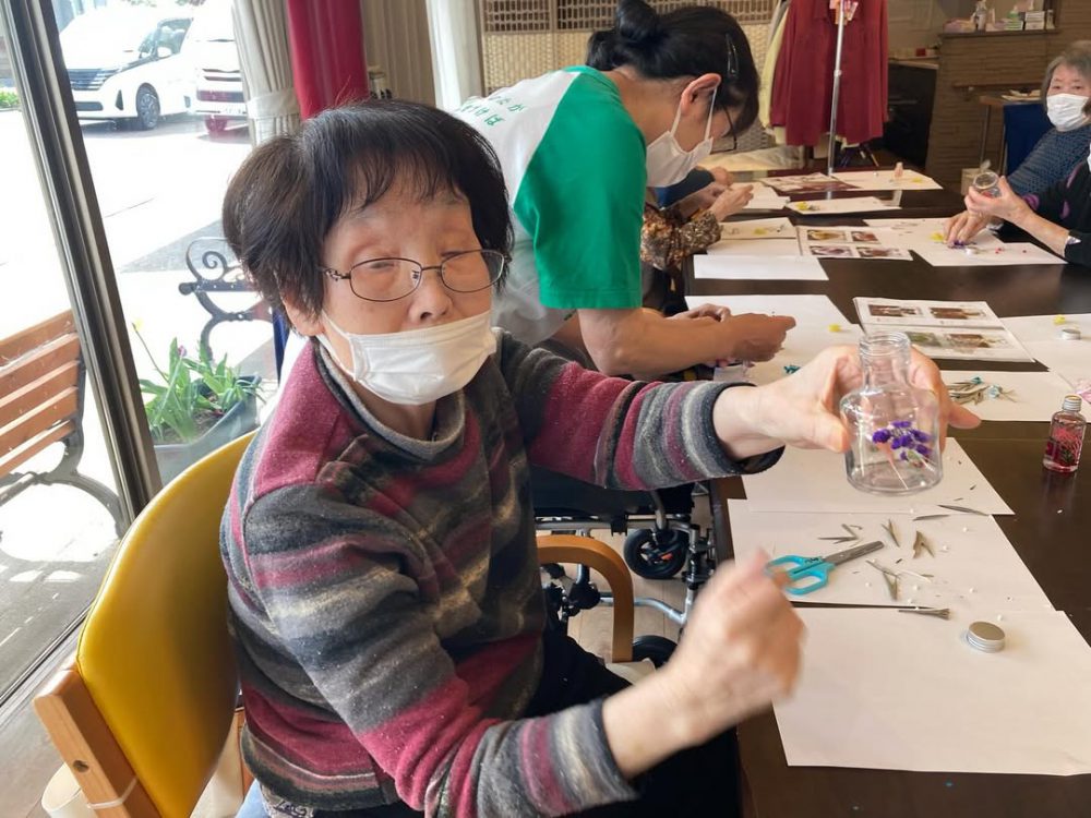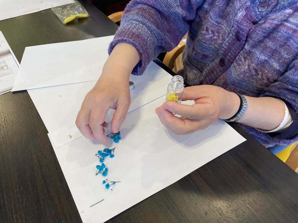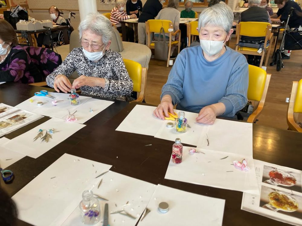 練馬区にある地域密着型デイサービス 西おおいずみ翔裕館です。 先週,デイではハーバリウム作成を開催しました ポプリの配置を色合いを考えながら瓶に入れていきます。 長い時間楽しんでいただけますので、ご自宅でもぜひ飾ってくださいね