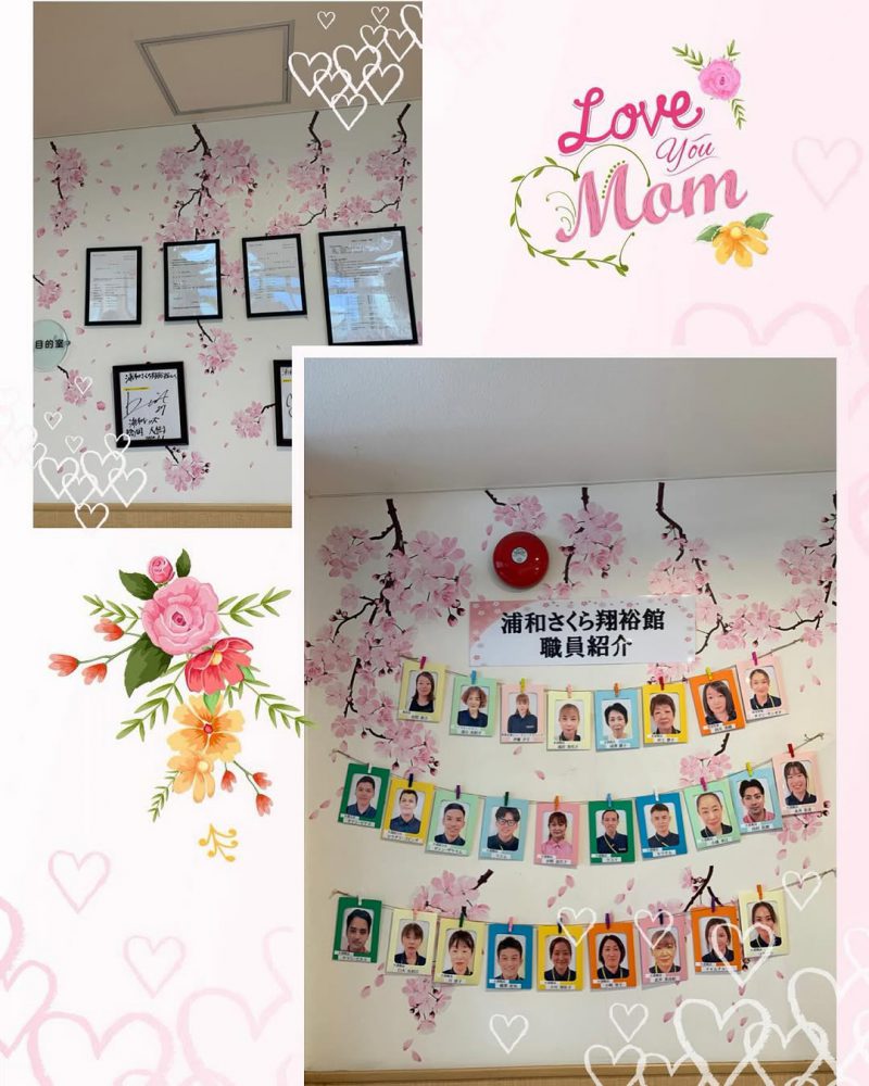 浦和さくら翔裕館 一階フロアはさくら一色でお出迎えいたします 施設名にもある『さくら』の花言葉は精神美です。 職員一同『精神美』をモットーに桜の様に皆様に愛される施設にしてまいります