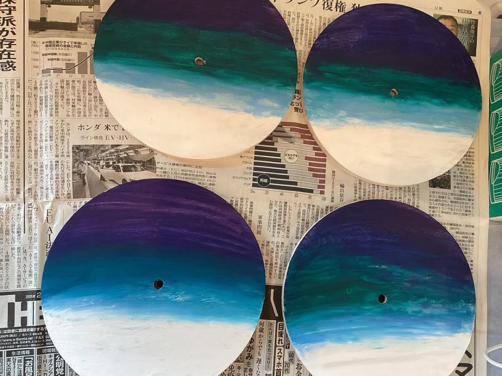 白、水色、青色のアクリル絵の具を重ね、