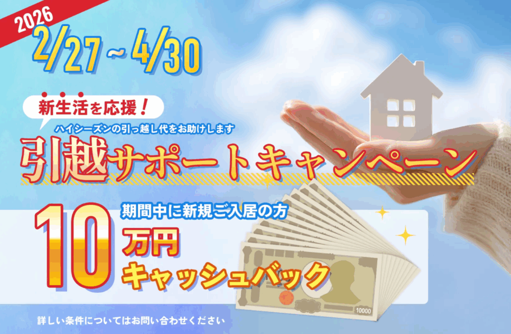 現在、入居をご検討中の皆さまに向けて、ご入居で10万円キャッシュバックキャンペーンを実施しております。