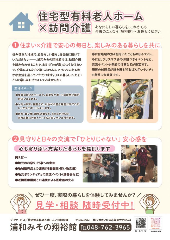 このたび、浦和みその翔裕館・南こしがや翔裕館では、住宅型有料老人ホームにて新たに訪問介護サービスを開始いたしました。